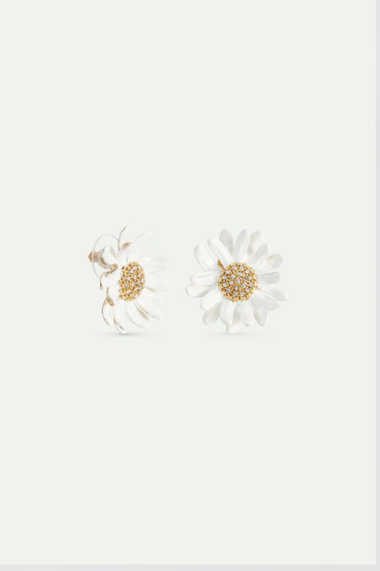 White And Gold Daisy Earrings With A Pavé Heart (STUD)