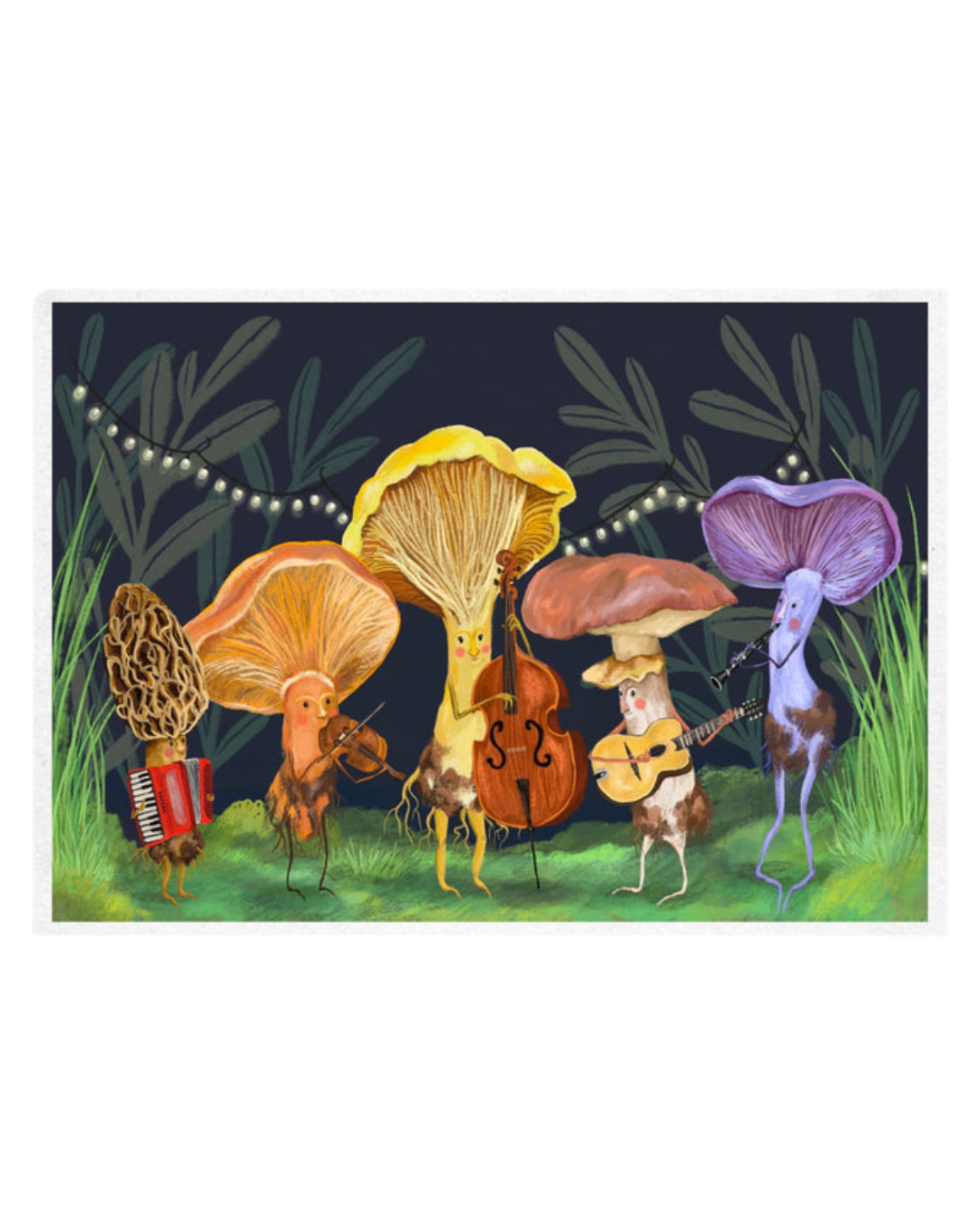 This print features an original illustration of a merry mushroom band playing gypsy jazz on the forest floor. Each character is a different type of edible mushroom, joyfully performing on its own folk instrument. Whimsical and full of movement, the artwork captures a lively woodland concert in miniature.