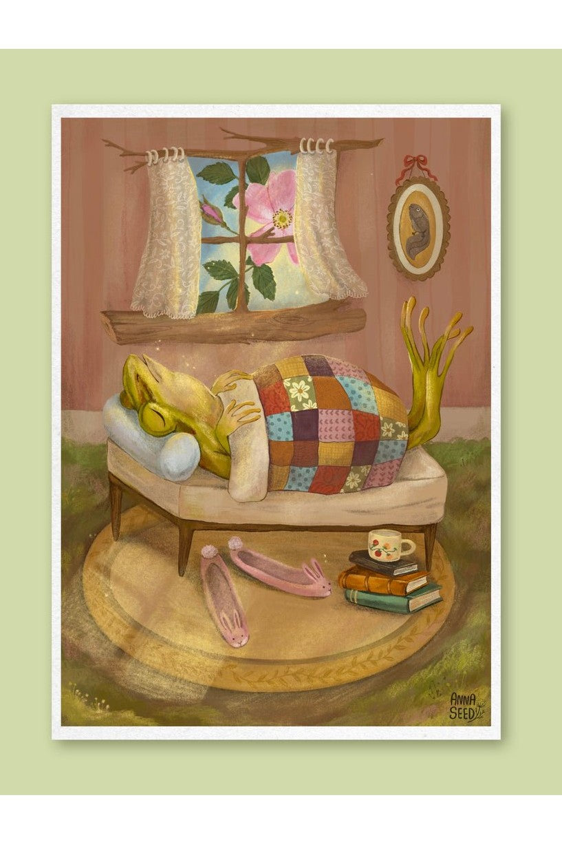 This print features an original illustration of a froggie chap enjoying a luxuriant sleep-in as the morning sun streams through his bedroom window. Each artwork is printed on demand on acid-free archival quality paper, and comes with a small white border to assist with framing.