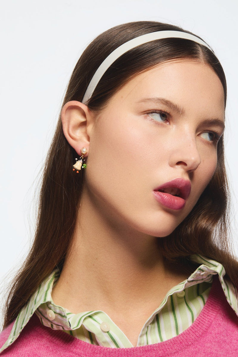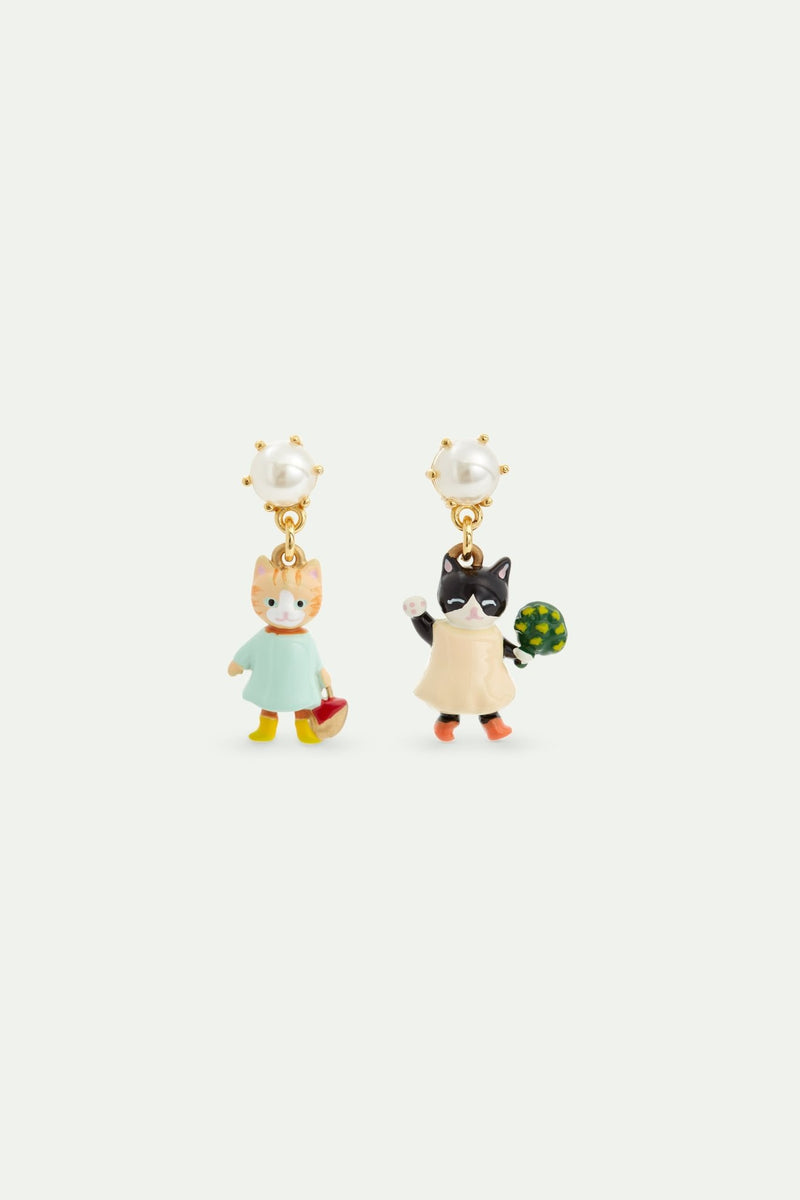 These whimsical asymmetrical dangle earrings feature a ginger and a black kitten, each hand-enamelled and dressed in charming picnic outfits. Finished with a white artificial pearl, they bring a playful narrative feel while remaining delicate and wearable.