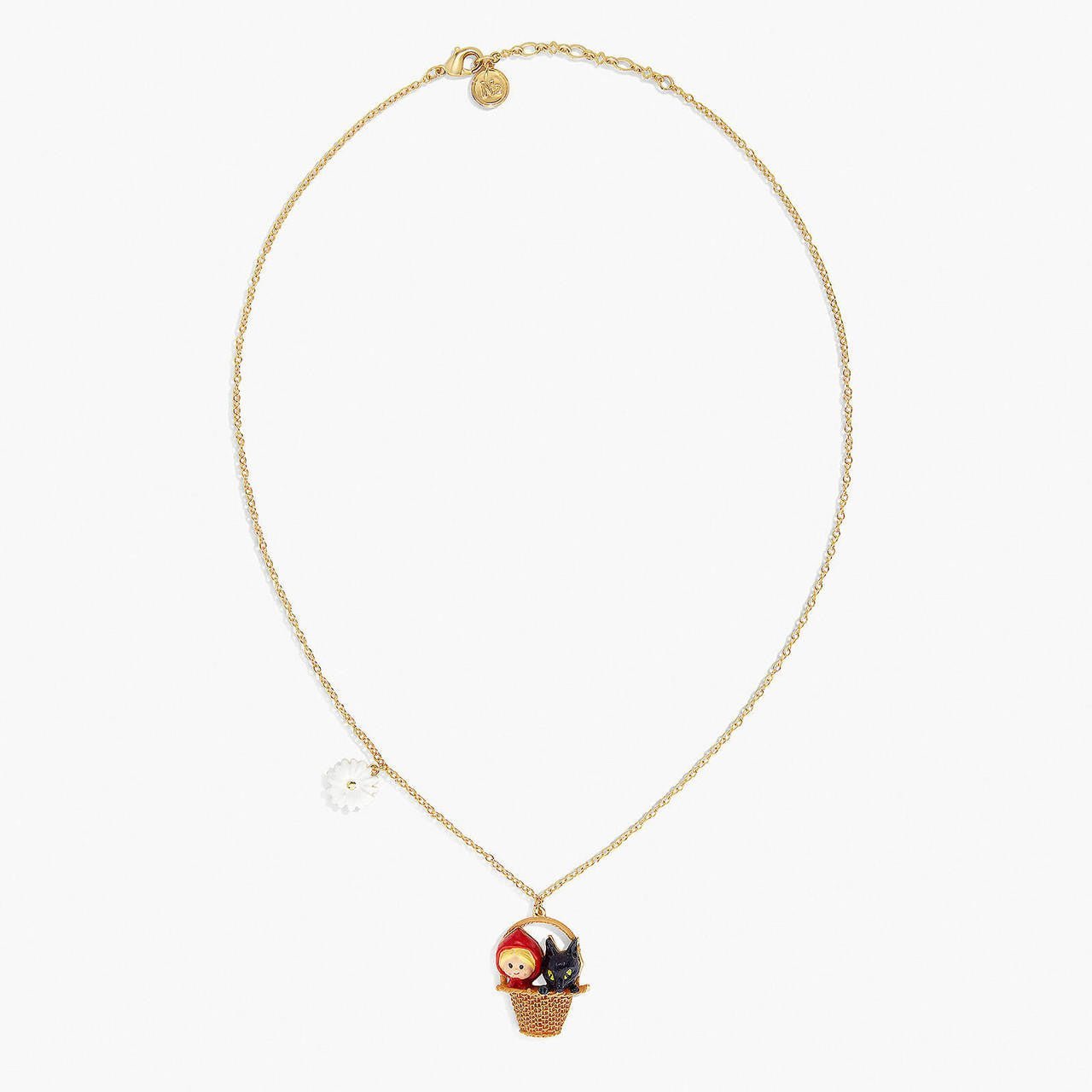 Step into a storybook world with the Basket, Little Red Riding Hood and Big Bad Wolf Pendant Necklace from Les Néréides' A Walk in the Woods collection. This whimsical piece captures the iconic fairytale with charming detail—featuring Little Red Riding Hood, the Big Bad Wolf, and a daisy-filled basket, all hand-painted with childlike lines that evoke nostalgic wonder. A wearable tale of innocence and intrigue.