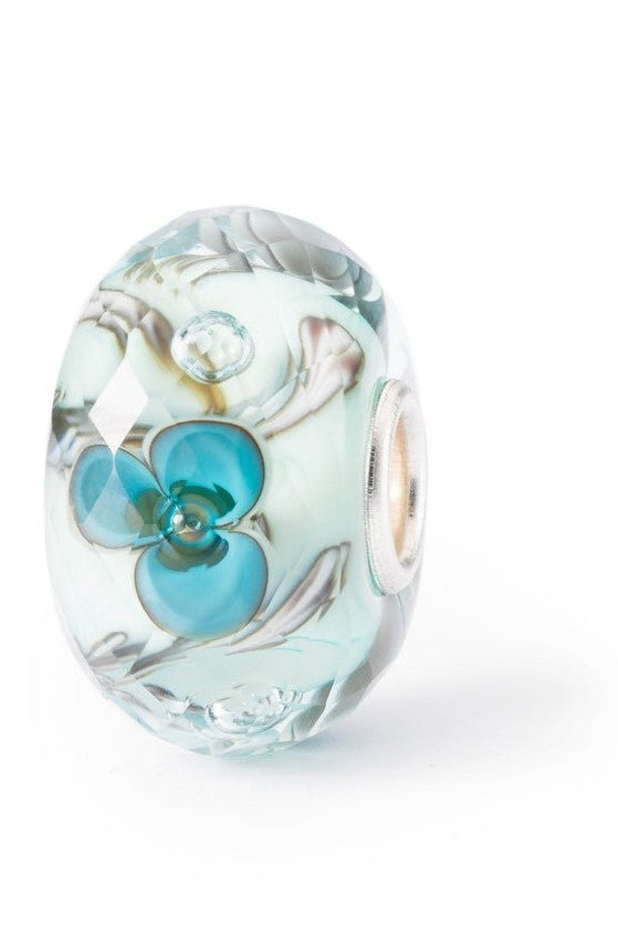 A beautiful turquoise flower in facetted glass set upon swirling light blue clouds and pale streaks of straw yellow.