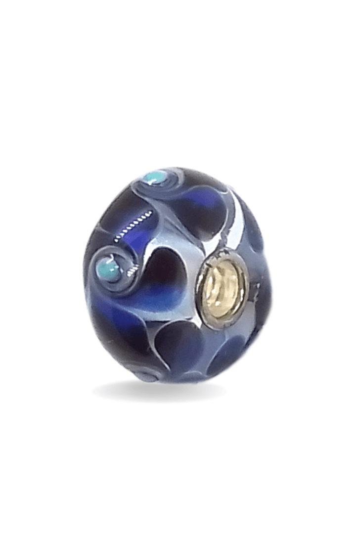 This is a unique bead by Trollbeads. There are six dark blue flowers around the glass bead. The photo is the actual bead that you will be buying.