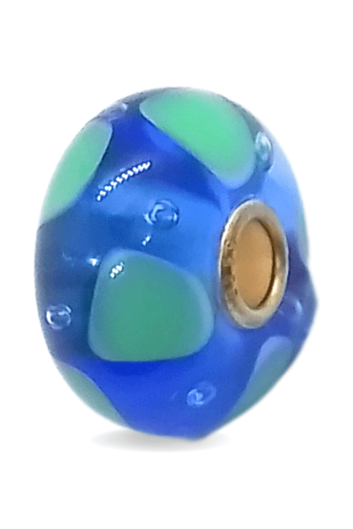 This is a unique bead by Trollbeads. There are blue and mint patterns around the glass bead. The photo is the actual bead that you will be buying.