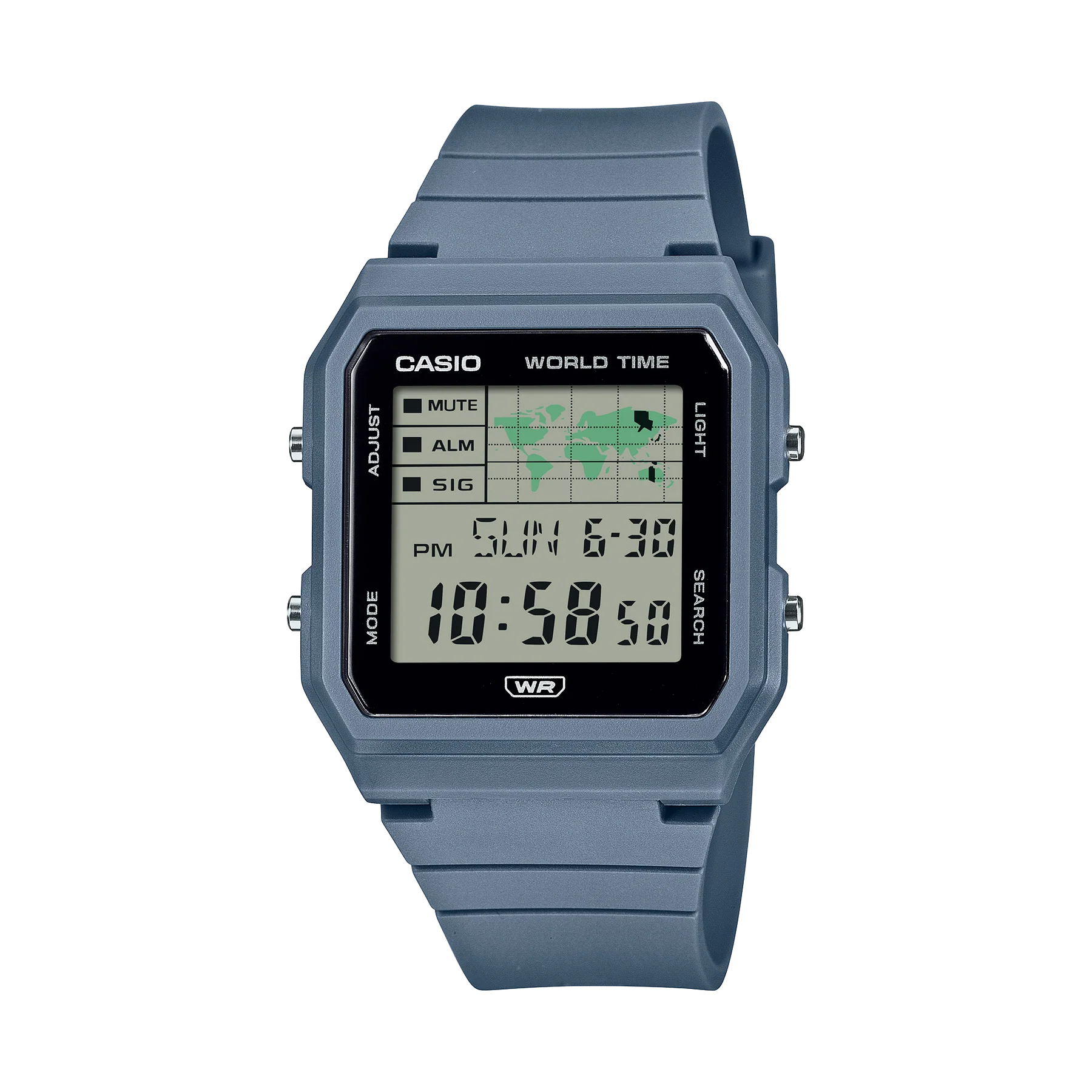 A compact digital watch designed with a distinctive world map display that adds a sense of movement and curiosity to everyday timekeeping. The map in the top corner syncs with the current time, making it easy to visualise your place in the world while enjoying a lightweight, comfortable fit in a calm, wearable colour.