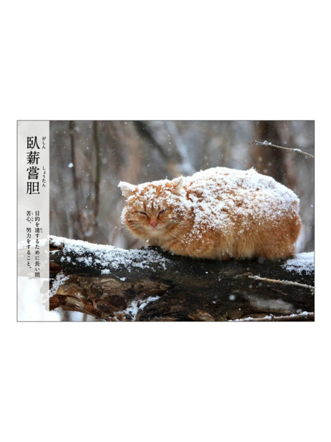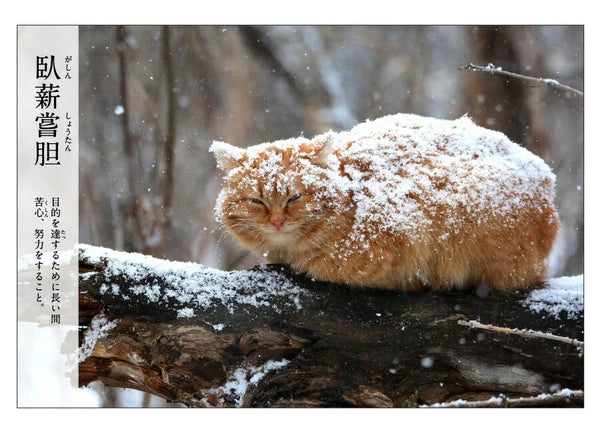 「臥薪嘗胆」 is a classical idiom meaning “to endure hardship in order to achieve a goal,” originating from ancient Chinese history and widely used in Japan to express quiet determination—making its pairing with an unbothered, snow-covered cat both poetic and subtly humorous.