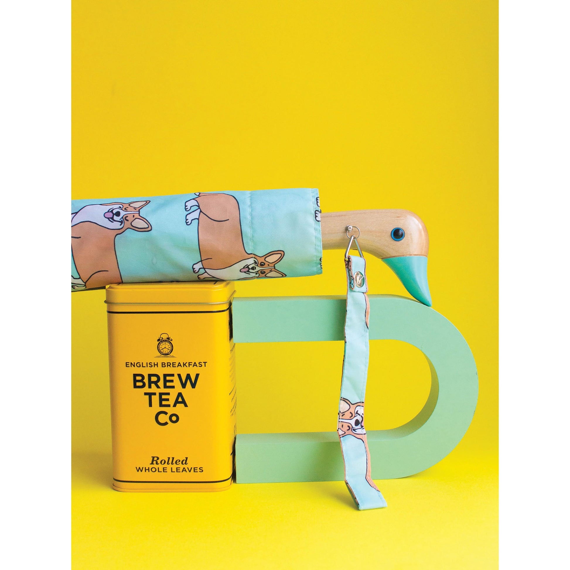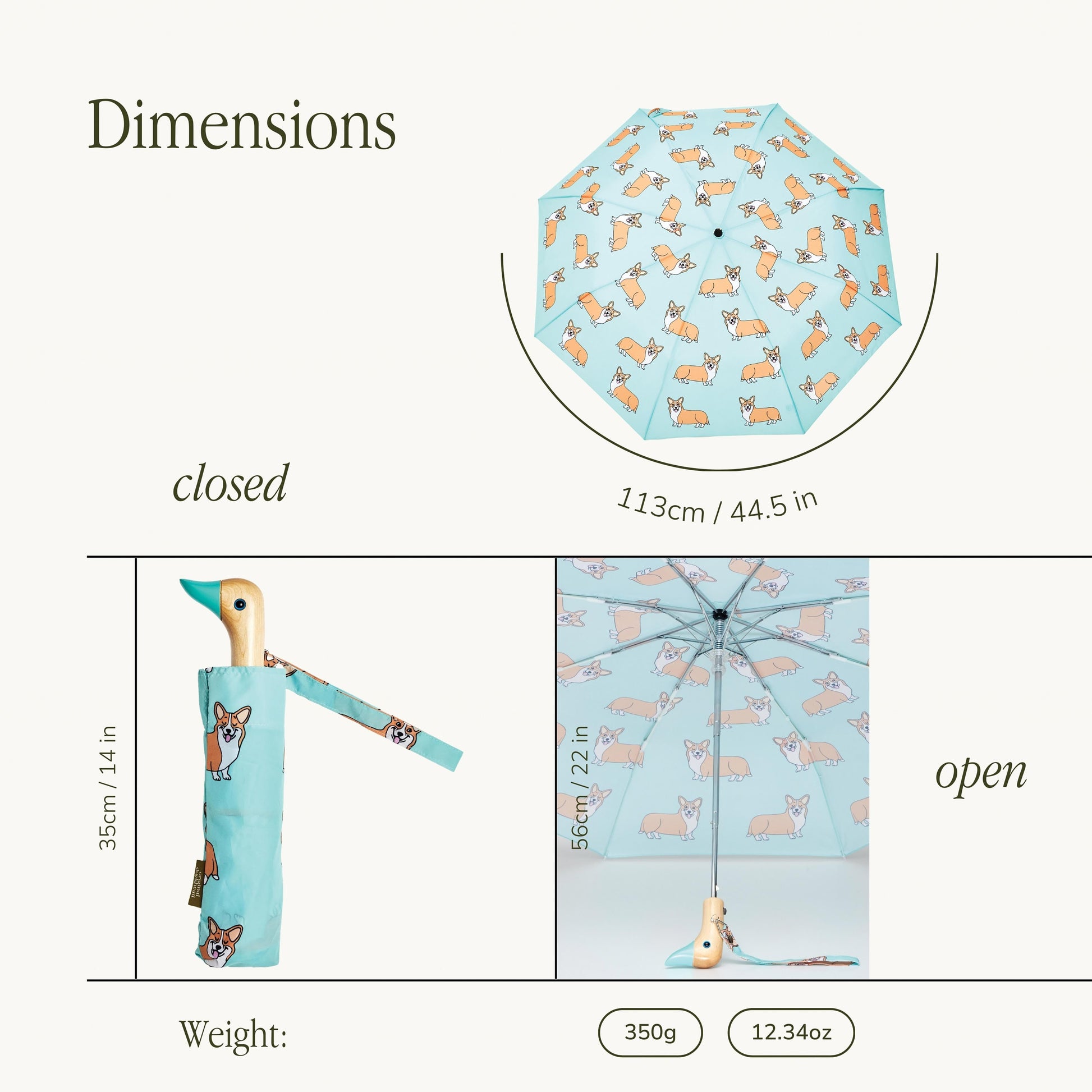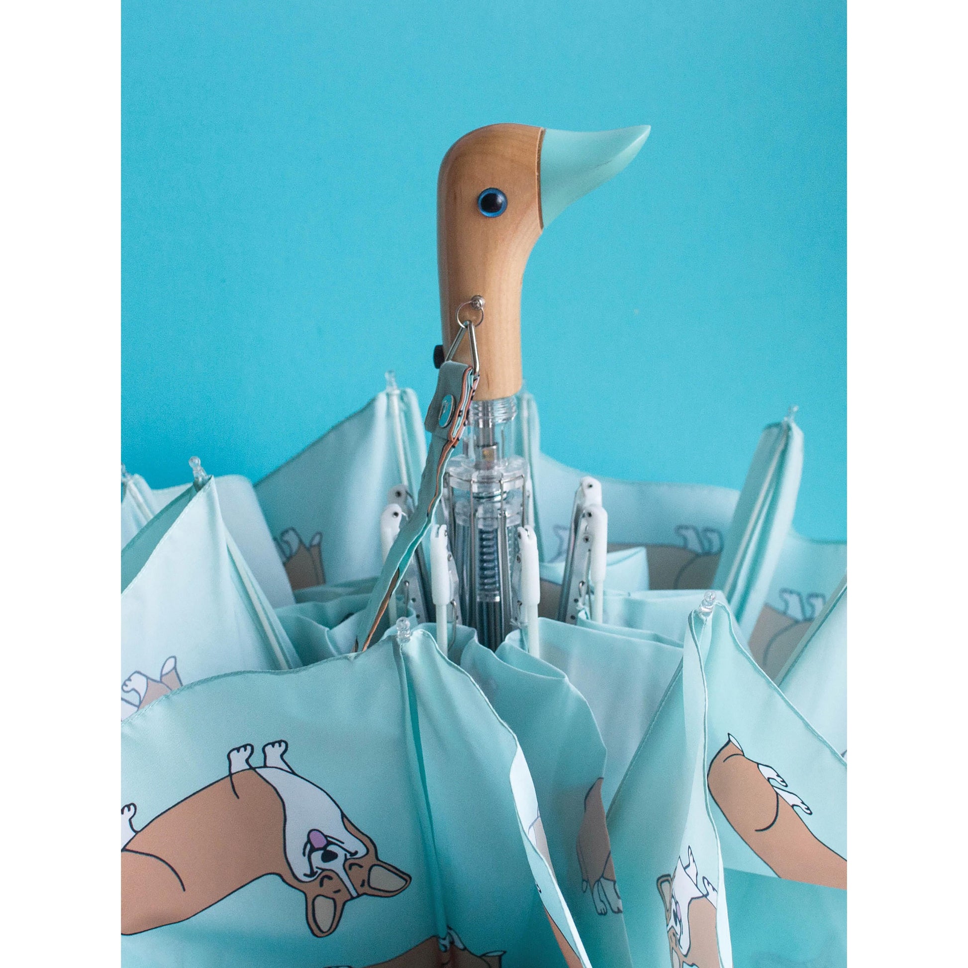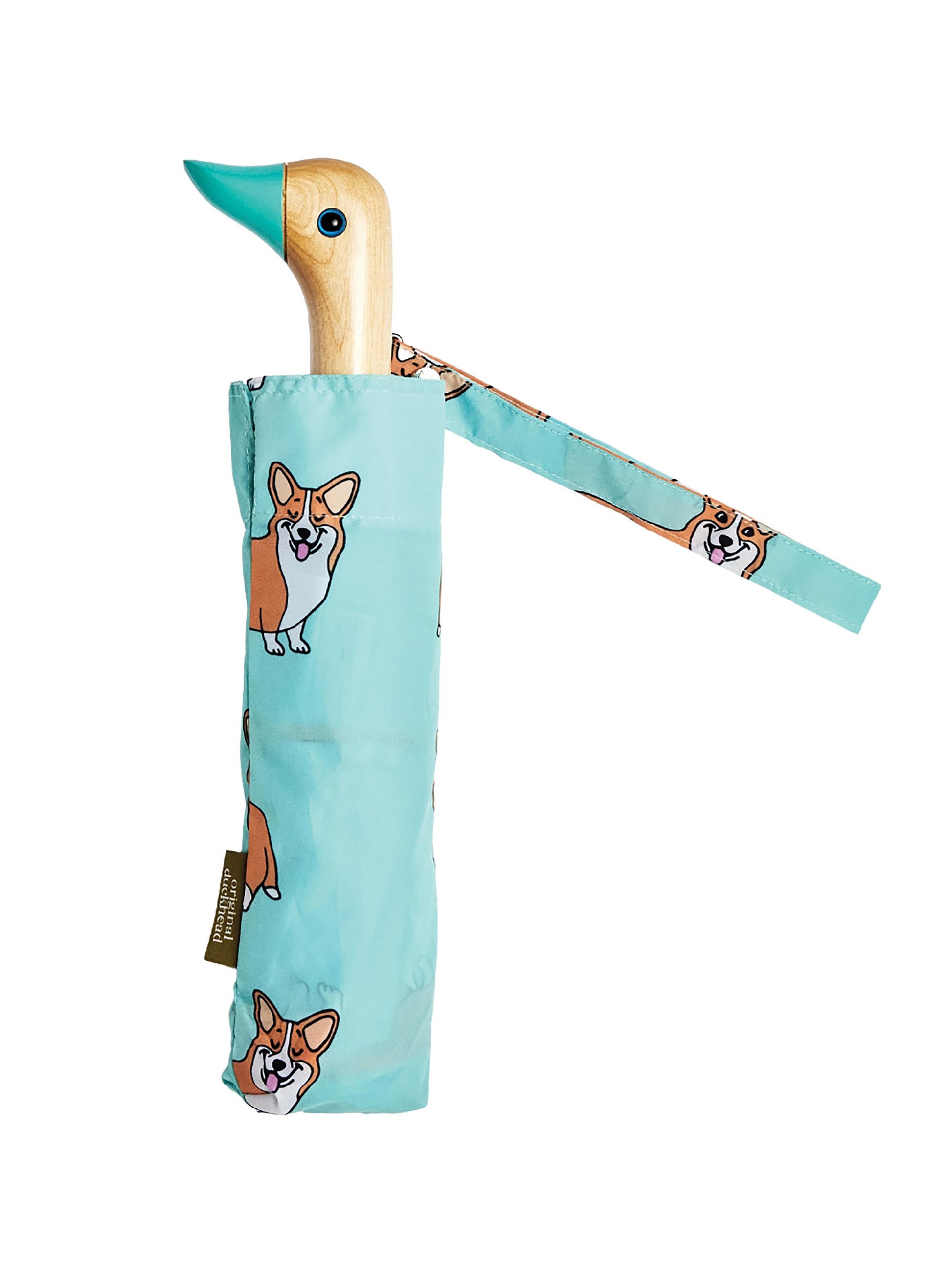 Stay dry in style with this limited edition compact umbrella, created in collaboration between Original Duckhead and Parisian brand Coucou Suzette. Featuring a playful Corgi dog print on a fresh mint background, each design includes a signature bright blue eye exclusive to this collection. Eco-friendly and durable, the umbrella is made from recycled materials and built to resist strong winds, while its compact size makes it the perfect everyday travel companion.
