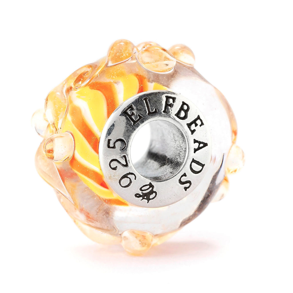 A radiant swirl of colour captured in motion, this bead feels like a wave blooming into light. Golden coral and warm amber tones flow through clear glass, forming petal-like shapes that echo the rhythm of sunlit tides. Lively yet soothing, it carries the warmth of summer and the quiet wonder of nature in motion.