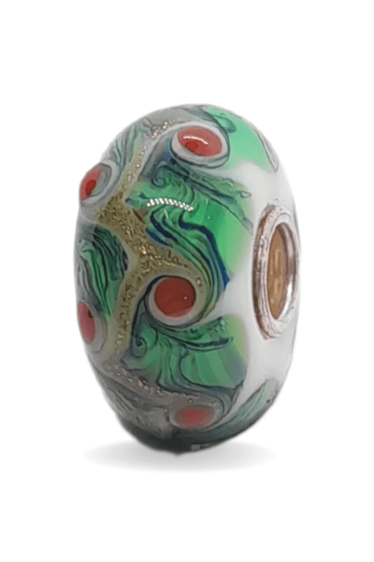 This is a unique bead by Trollbeads. There are patterns around the glass bead. The photo is the actual bead that you will be buying.