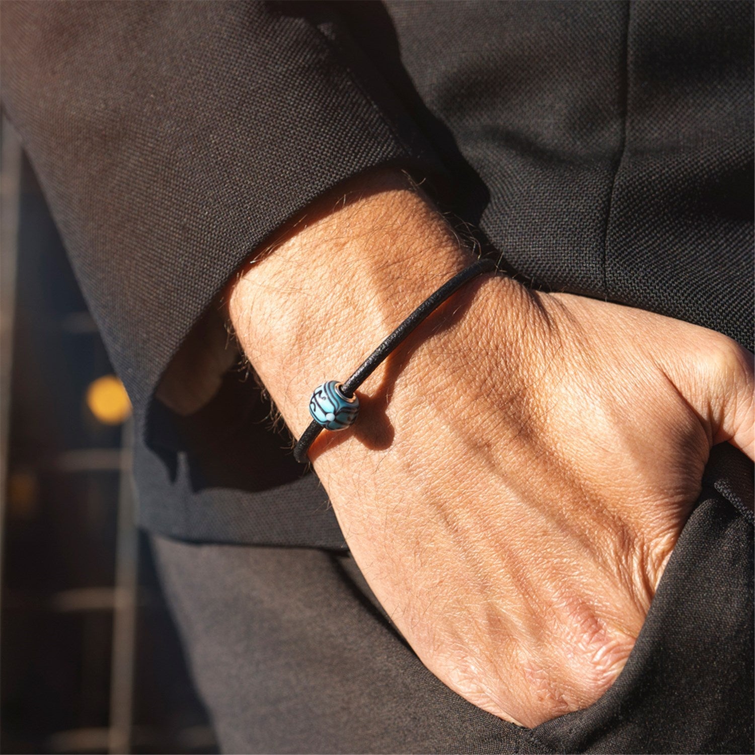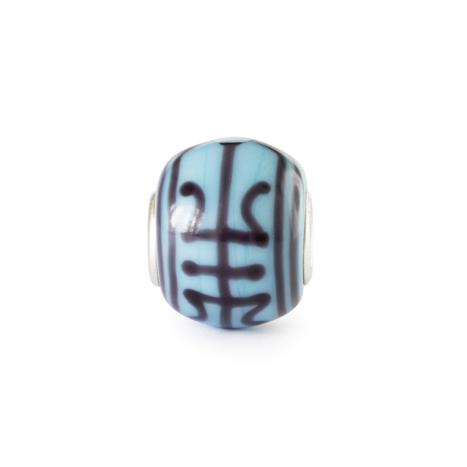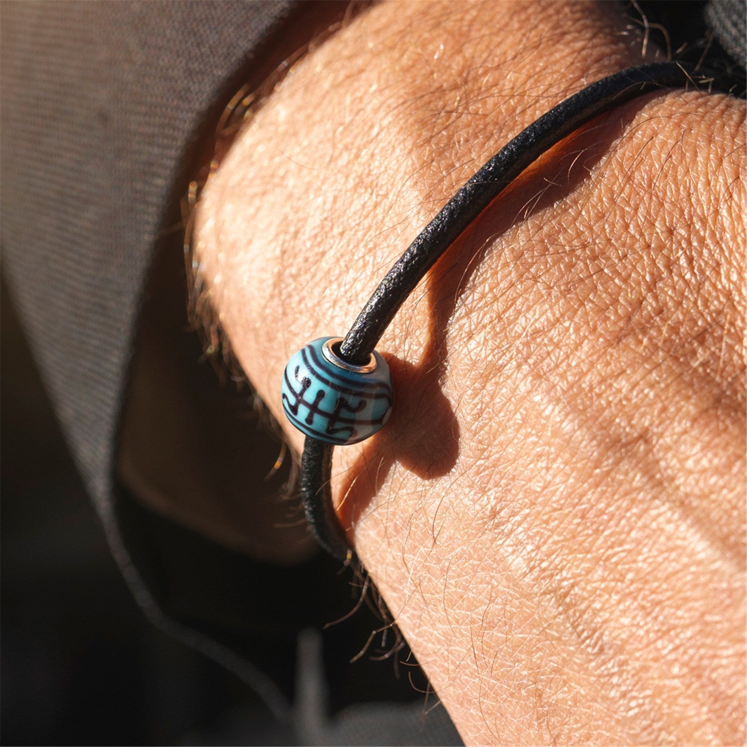 A striking handcrafted glass bead in soft sky blue, wrapped with flowing dark lines that symbolise continuity and connection. The smooth, rounded surface and contrasting pattern create a bold yet balanced look, making it a meaningful addition to any bracelet or necklace.
