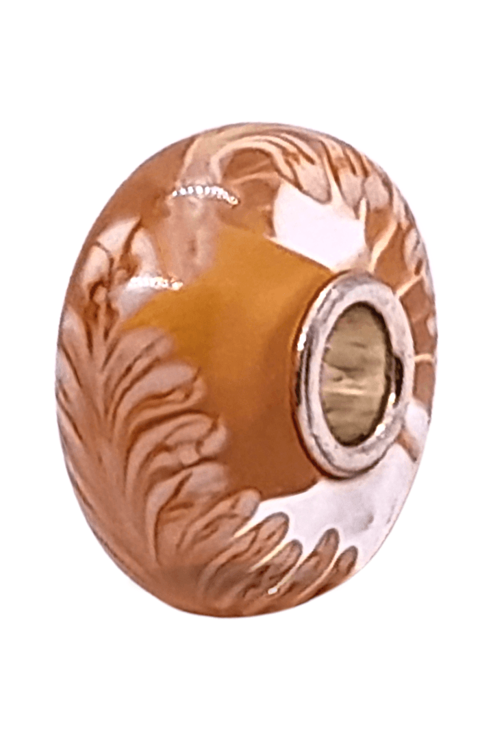 This is a unique bead by Trollbeads. There are complex patterns around the glass bead. The photo is the actual bead that you will be buying.