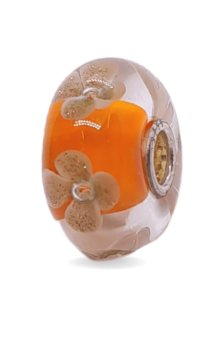 This is a unique bead by Trollbeads. There are flower patterns around the glass bead. The photo is the actual bead that you will be buying.