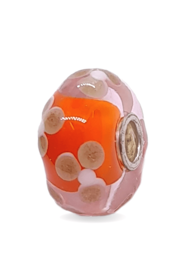 This is a unique bead by Trollbeads. There are flower patterns around the glass bead. The photo is the actual bead that you will be buying.