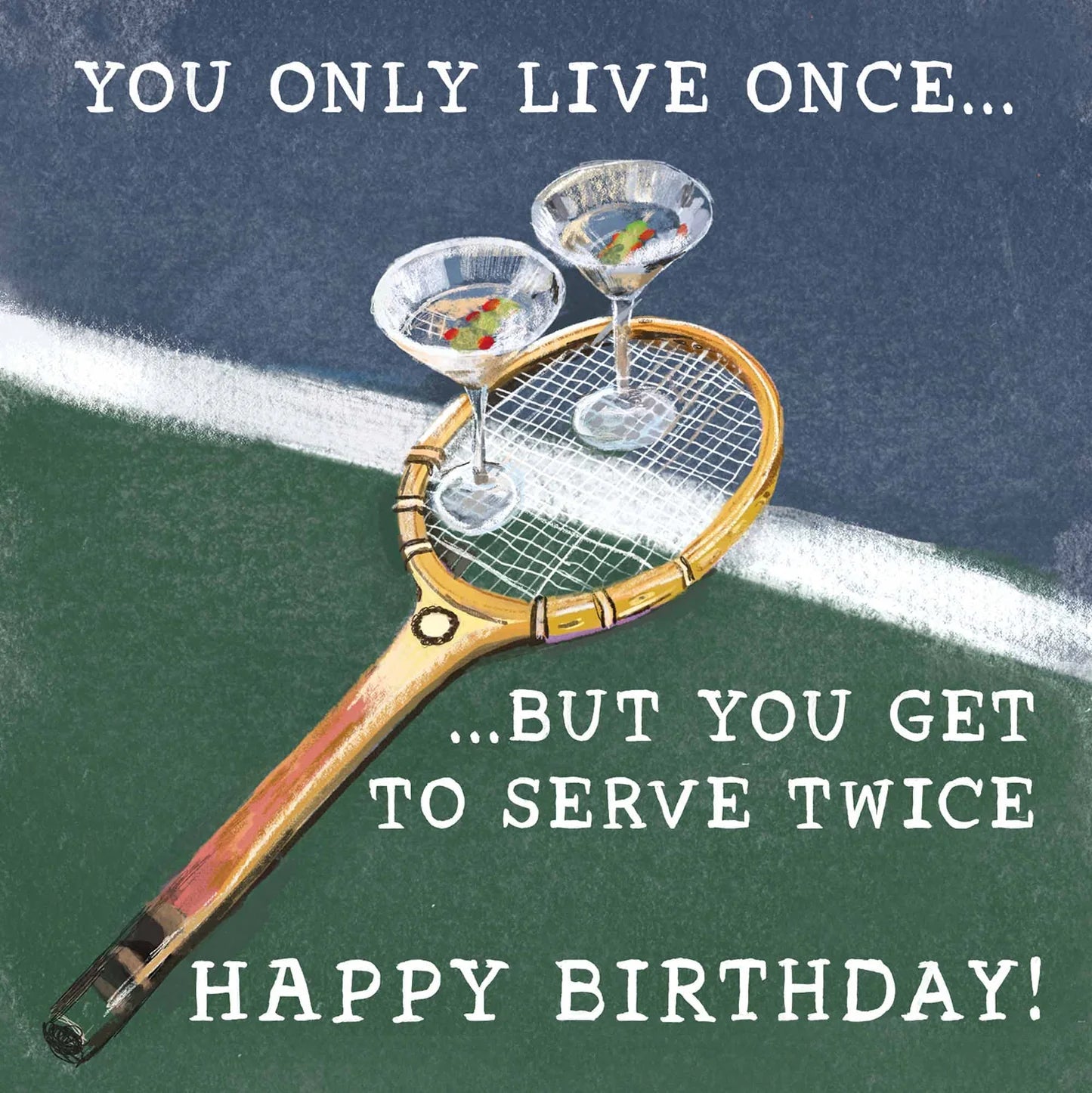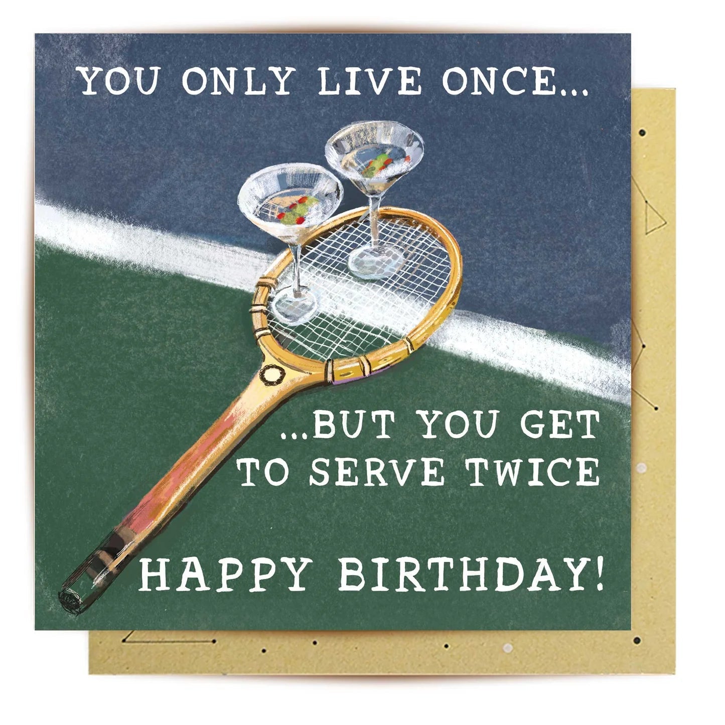 Raise a glass to another birthday with a serve of cheeky humour! The Perfect Match greeting card by La La Land features a playful illustration of martinis balanced on a tennis racket with the witty line: "You only live once... but you get to serve twice." A great choice for tennis lovers or anyone who enjoys a clever pun and a good time.