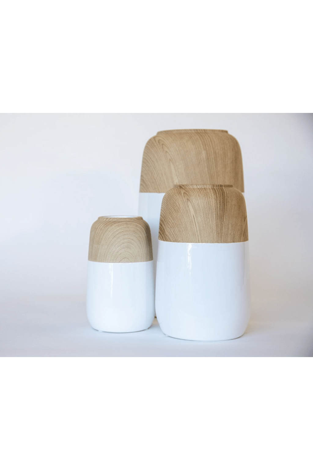 Modern glazed ceramic vase wrapped with a timber grain finish. Beautiful with a bouquet of dried or fresh flora.