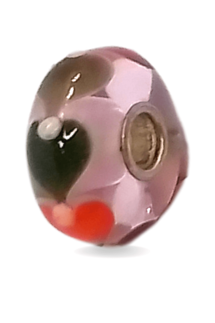 This is a unique bead by Trollbeads. There are colourful hearts patterns around the pink glass bead. The photo is the actual bead that you will be buying.
