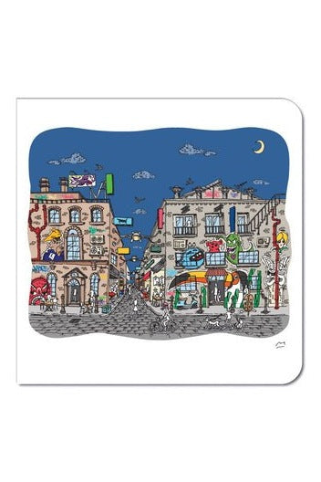 Featuring a whimsical illustration of the famous Melbourne Laneways, this card is an ideal souvenir or keepsake of Melbourne. It is 135 x 135mm square card with matching square envelope, blank inside and comes in a protective cellophane sleeve.