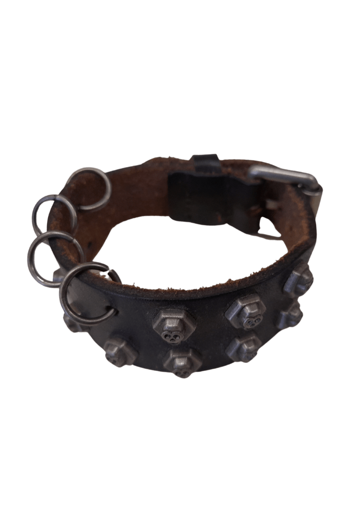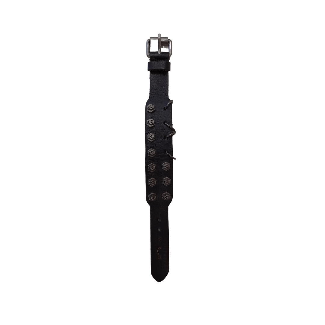 Handmade leather bracelet with skeleton design in black.