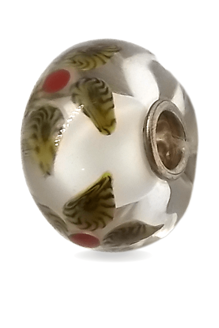 This is a unique bead by Trollbeads. There are leaves patterns around the glass bead. The photo is the actual bead that you will be buying.