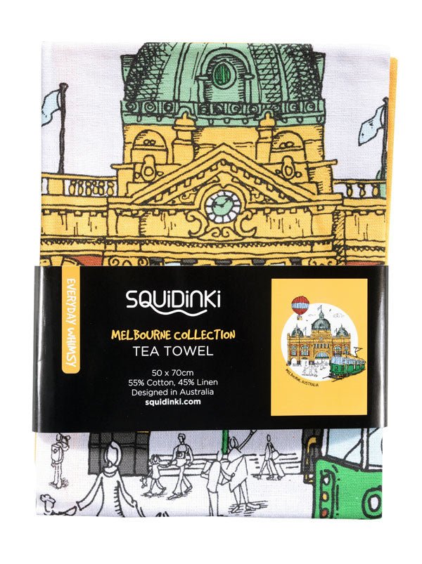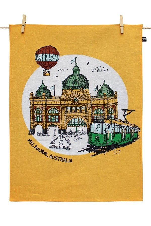 Brighten up your kitchen with this charming tea towel featuring Flinders Street Station, Melbourne's iconic landmark. The illustration beautifully captures the city's character, complete with a classic Melbourne tram and a whimsical hot air balloon.