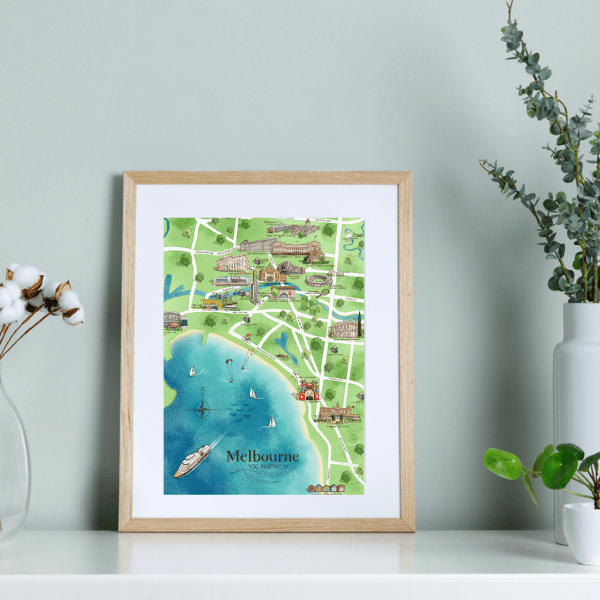 Brighten up your space with this A4 unframed art print featuring a hand-illustrated map of Melbourne’s most iconic tourist attractions. With its vibrant design and detailed layout, it makes a cheerful and informative addition to any home, office, or travel-inspired gallery wall.