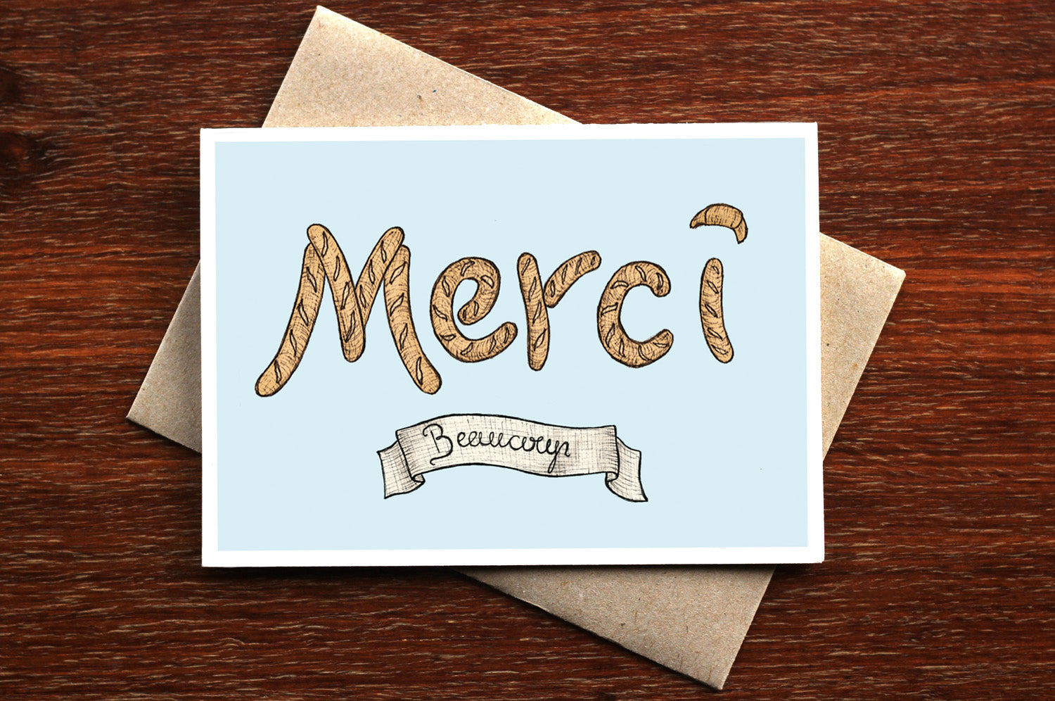 A playful French-themed thank-you card featuring “Merci” hand-lettered to look like freshly baked baguettes, with a charming banner reading “beaucoup” underneath. Light-hearted and full of personality, it’s a delightful way to express heartfelt thanks — whether for a gift, a favour, or a kind gesture. Blank inside so you can write your own message.