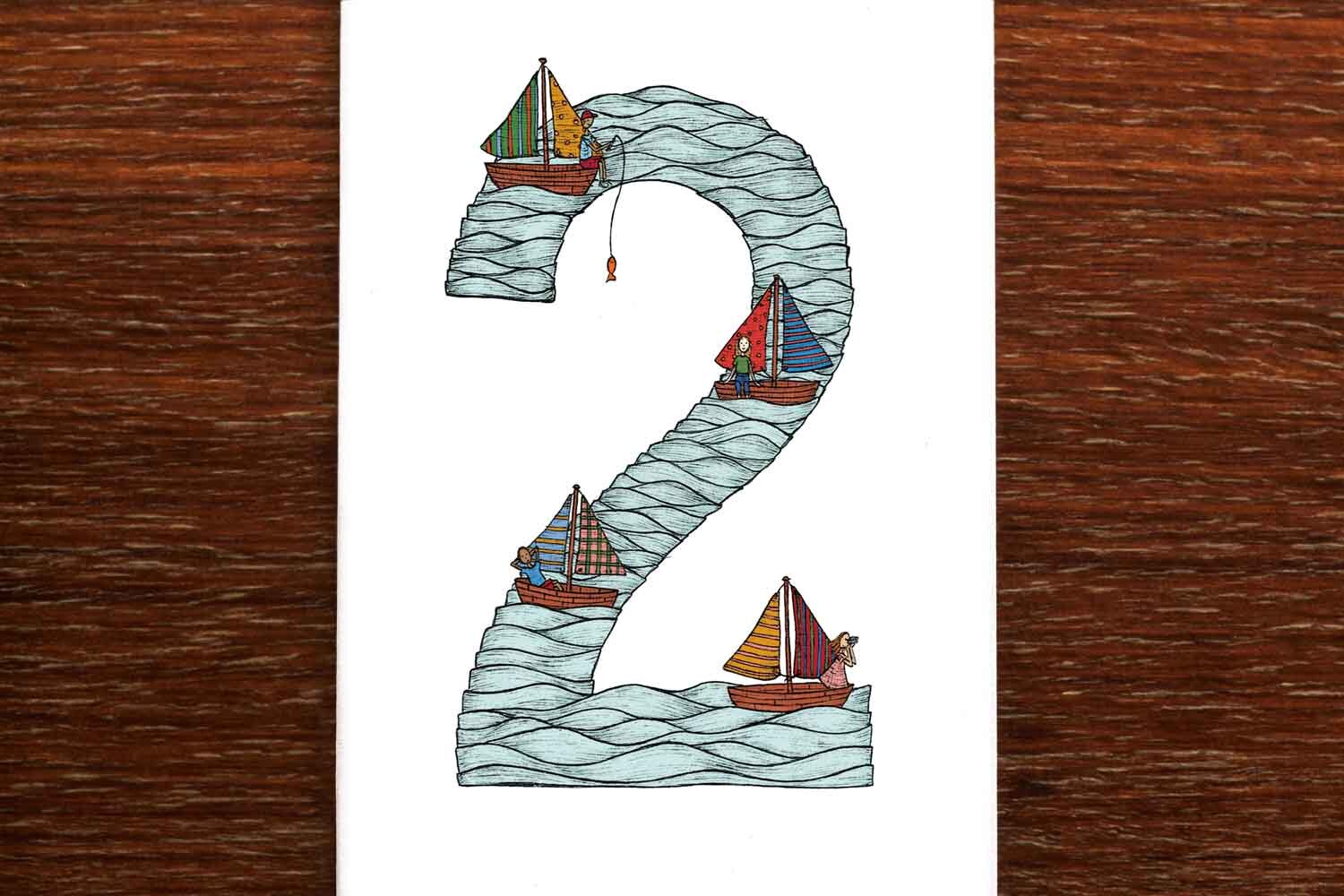 A charming maritime-themed second-birthday card featuring the number 2 formed entirely by rolling waves, with tiny colourful sailboats bobbing along its curves. Playful, imaginative and full of gentle movement — a wonderful way to mark a little one’s big second milestone. The card is blank inside, ready for your own birthday message.