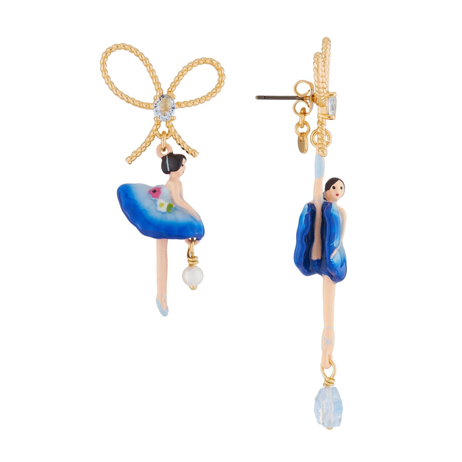 Graceful and poetic, the Pas de Deux Blue Gradient with Flowered Belt Earrings by Les Néréides capture the beauty of ballet in motion. Each mismatched earring features a delicately hand-enamelled ballerina in a flowing blue gradient tutu adorned with tiny floral details. Suspended from elegant gold bows set with sparkling crystals, these earrings embody femininity, lightness, and timeless French artistry.