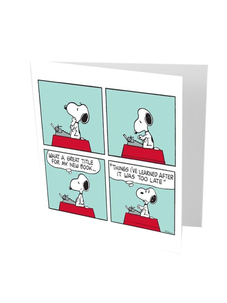 Snoopy’s wit is in full swing in this Peanuts greeting card featuring the beloved beagle at his typewriter. With his classic dry humour, Snoopy muses over the perfect title for his next masterpiece — “Things I’ve Learned After It Was Too Late.” A clever and relatable card that’s perfect for writers, dreamers, and anyone who appreciates Schulz’s timeless humour.