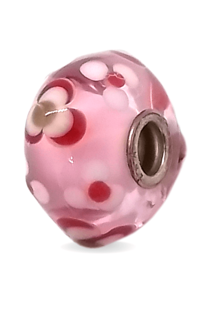 This is a unique bead by Trollbeads. There are pink flowers patterns around the glass bead. The photo is the actual bead that you will be buying.
