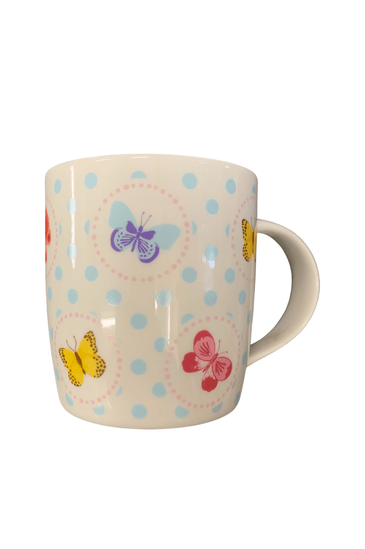 This fun vibrant mug featuring colourful butterflies in polkadot pattern is a good addition to your household and is perfect for coffee/tea!