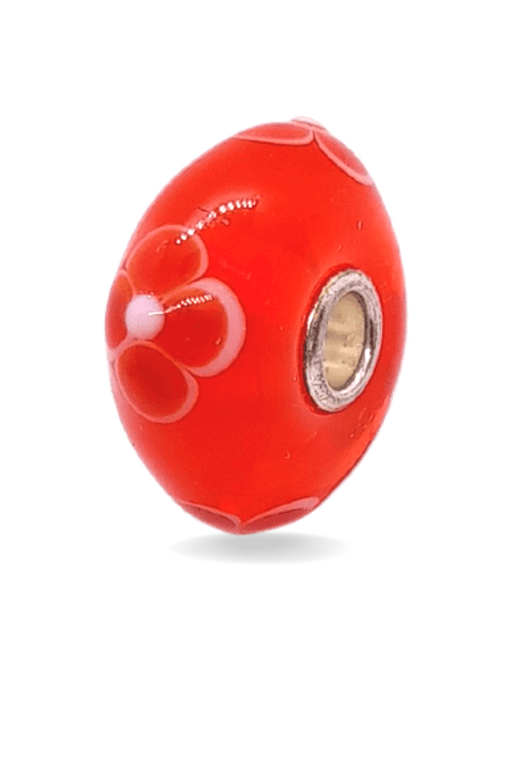 This is a unique bead by Trollbeads. There are four red flowers around the glass bead. The photo is the actual bead that you will be buying.