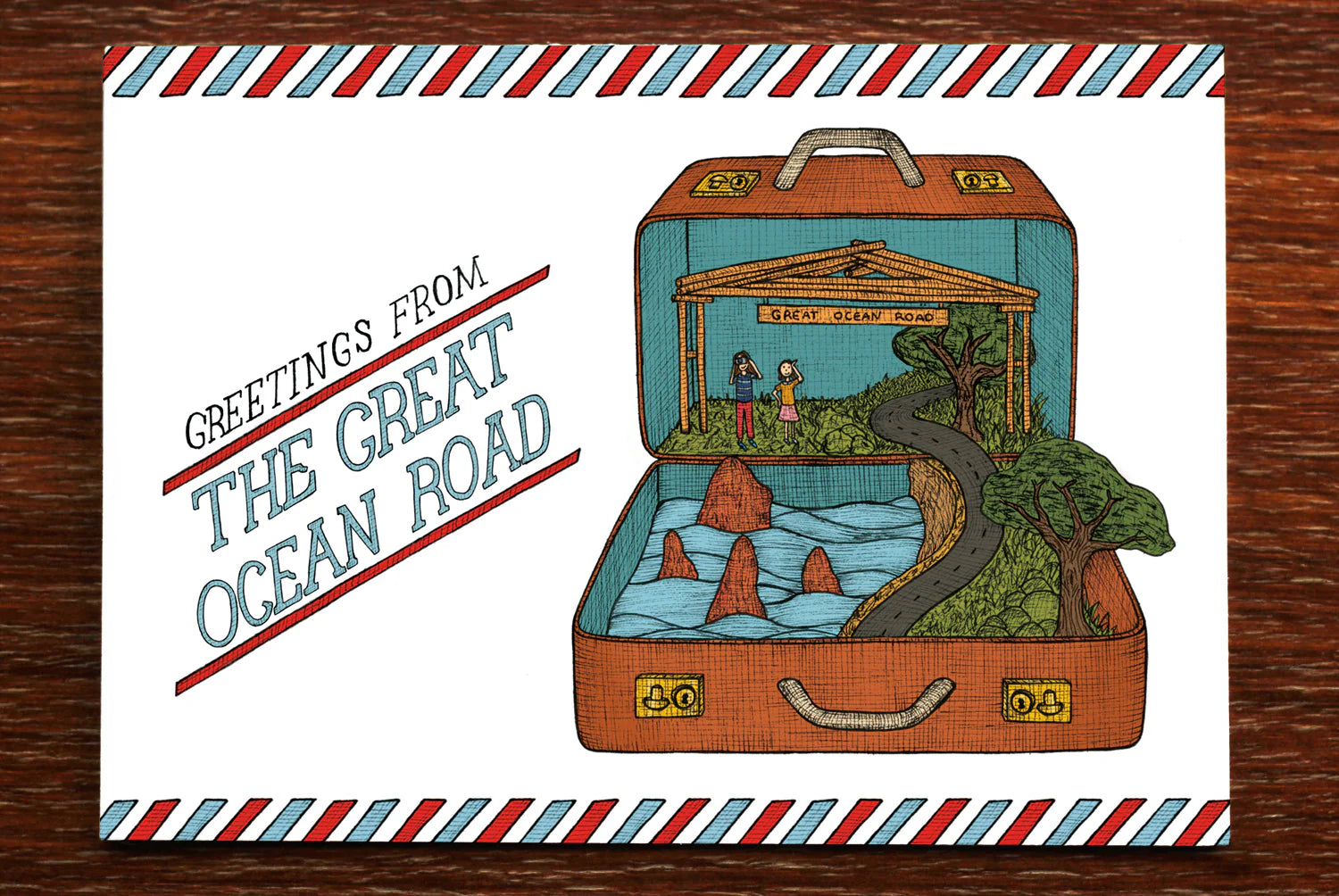 This hand-illustrated postcard captures the iconic journey along Australia’s Great Ocean Road, imagined through The Nonsense Maker’s playful and story-driven style. Designed and printed in Melbourne, it’s a thoughtful keepsake that reflects the wonder of Australian landscapes, whether you’re sending it overseas or keeping it close to home.