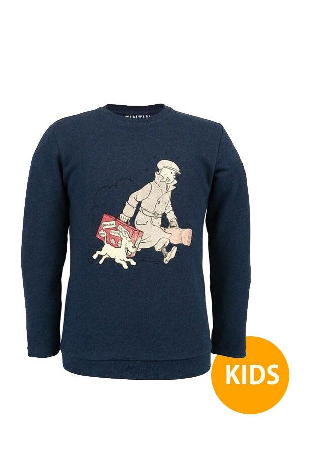 Designed in Belgium and manufactured in Portugal, this new soft fabric Sweat-shirt, features the wonderful cover illustration from the issue of Le Petit Vingtième dated 28th November 1935. Garment care information: Material: 100 % cotton Do not tumble dry, machine wash at 30°C, programme as delicate wash Product details: Fabric: Flacked light weight materiel in blue Printed colour motif of Tintin with suitcase New Styling features: round collar with flat stitching and new garment shape, see size details.