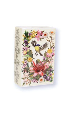 Embrace the beauty of nature with our ceramic four-sided vase, Gardens Botanical Blooms, adorned with exquisite illustrations by Laura Ramos. This unique vase showcases the enchanting Australian native flora and fauna. Add a touch of elegance and charm to your space while displaying your favorite blooms.