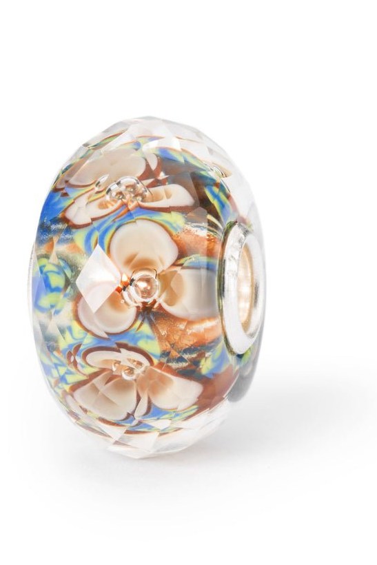 Cream-coloured flowers reveal themselves in this facetted glass bead upon leaves of yellow and blue. If you look closely, you will find sparkling cobber colors in the meadow.