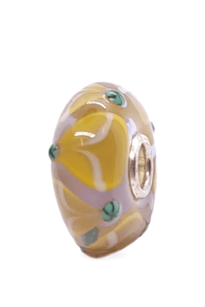 This is a unique bead by Trollbeads. There are droplet patterns around the glass bead. The photo is the actual bead that you will be buying.